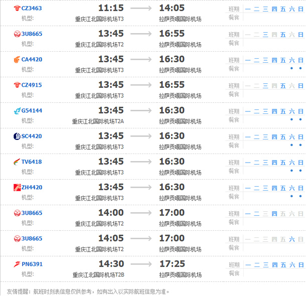 以上就是重庆飞拉萨的航班时刻表,起飞时间,到达时间,及固定航班日期。
