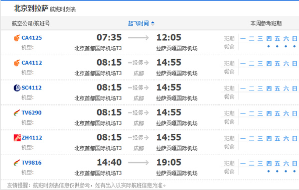 以上就是北京飞拉萨的航班时刻表,起飞时间,到达时间,及固定航班日期。