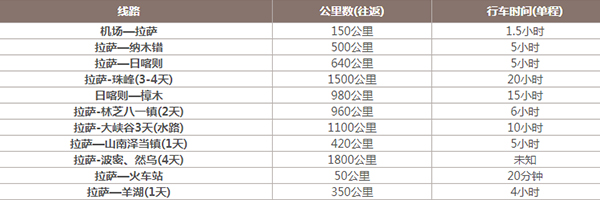 西藏包车游以前按公里数计算比较多,一般4-5元/公里,去阿里(大北线)、然乌等地的路况较为复杂,车型要求比较高,价格相对会高一些。拉萨市区到西藏各地区往返公里数: